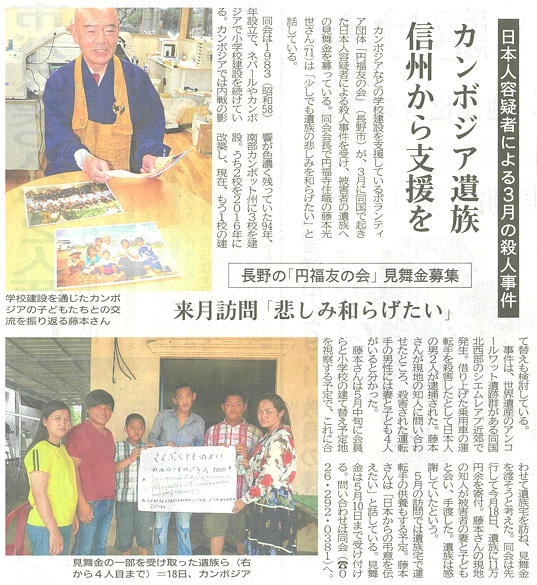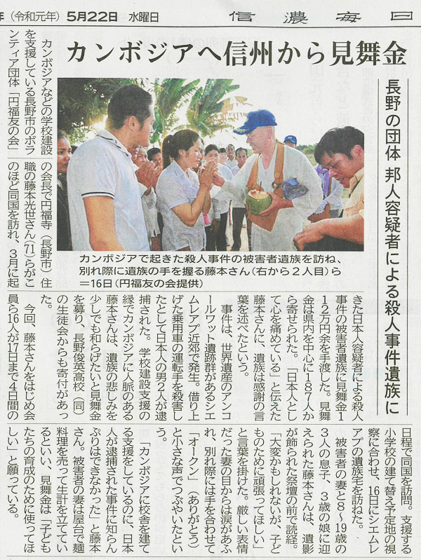 ご遺族にお見舞金を届けたことが5月22日付信濃毎日新聞に紹介されました。